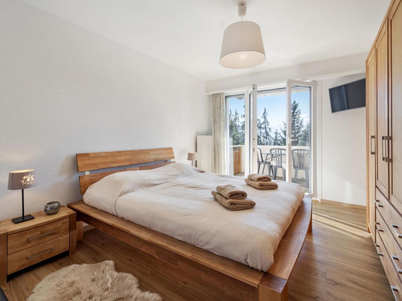 Apartment. 4-room apartment 100 m2, on the upper ground floor, nice furnishings: livingdining room with cable-TV, flat screen TV, video, radio, CD-player and DVD. 1 room with 1 double bed (160 cm), cable-TV (flat screen TV). Exit to the balcony, south facing position. 1 room with 1 double bed (160 cm). 1 childrens room with 2 x 2 bunk beds. Kitchen (oven, dishwasher, ceramic glass hob, micro wave, electric coffee machine) with dining table. BathWC, showerWC, double hand-basin. Large balcony, south facing position. Balcony furniture, deck chairs (1). View of the mountains and the countryside. Facilities: Internet (Wireless LAN [WLAN]). Garage space n 26, height 200 cm. Nespresso coffee machine (capsules are not provided).